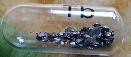 铽为银白色金属,质地较软且具延展性。铽金属有毒具有较高的反应性应保存在充有惰性气体的容器或真空容器中。铽具有极高的磁性能,居里温度Tc高达920摄氏度,在磁场中能够表现出极高的磁能积和矫顽力。