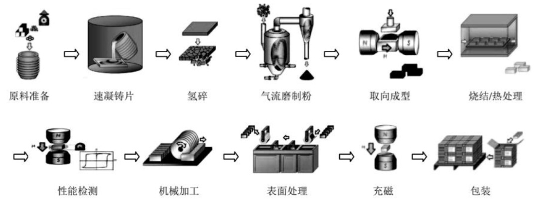 烧结钕铁硼的制备采用典型的粉末冶金工艺,主要包括以下步骤: