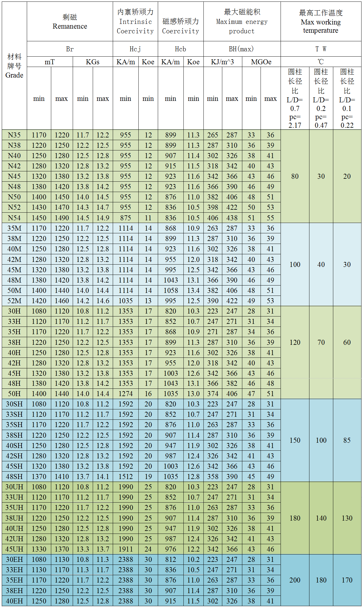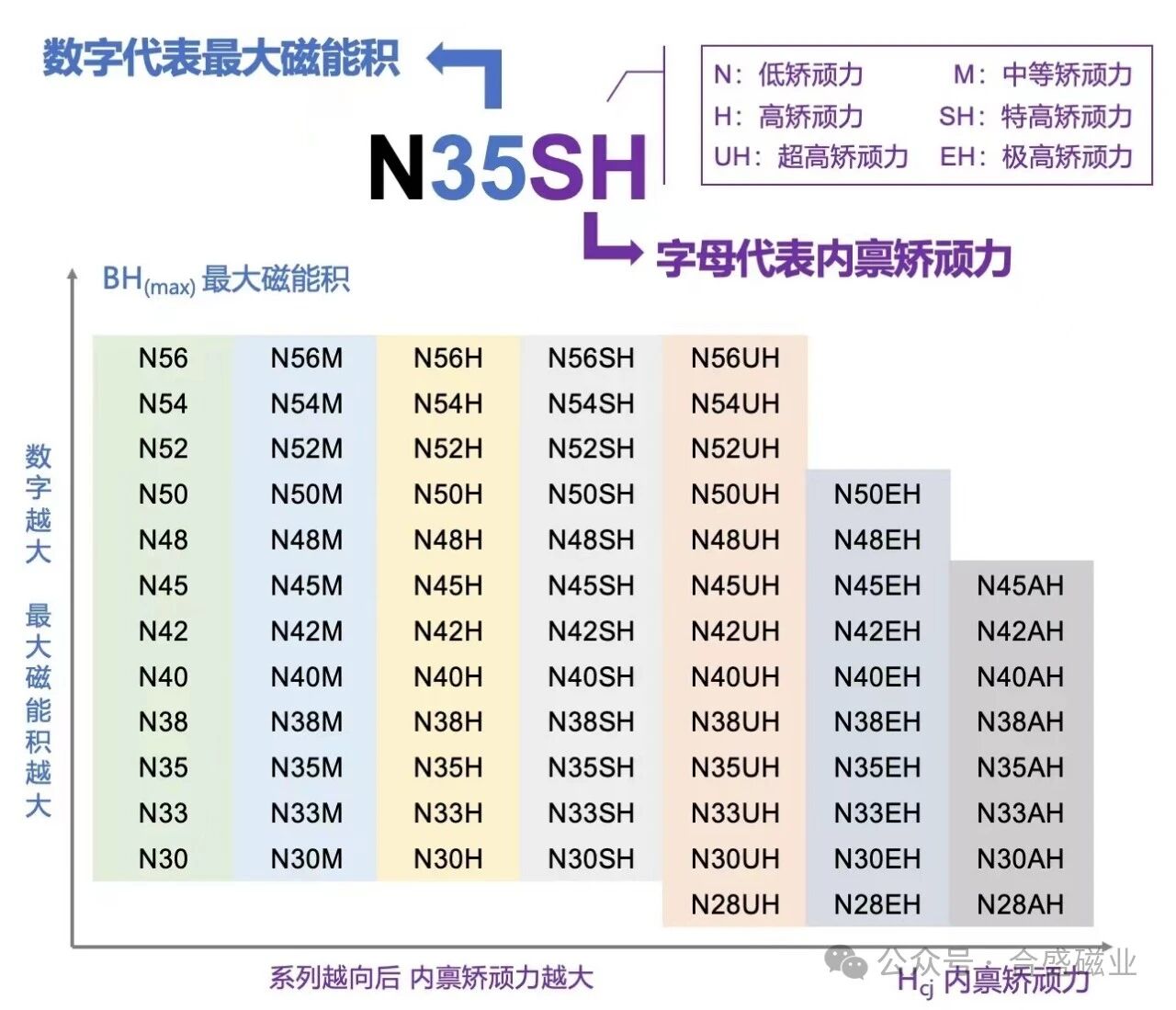 主称代号由钕(Nd)、铁(Fe)、硼(B)元素的化学符号组成,代表材料的基础成分。数字部分表示最大磁能积(BH)max的标称值,数字越大表明磁能积越高,例如N48比N35具有更强的磁能。字母后缀表示内禀矫顽力HcJ的分级,从低到高依次为:N(普通)、M(中等)、H(高)、SH(特高)、UH(超高)、EH(极高)和AH(特高)。