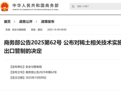 商务部于2025年10月9日连续发布第61号和第62号公告,分别对稀土相关技术及境外相关稀土物项实施出口管制。