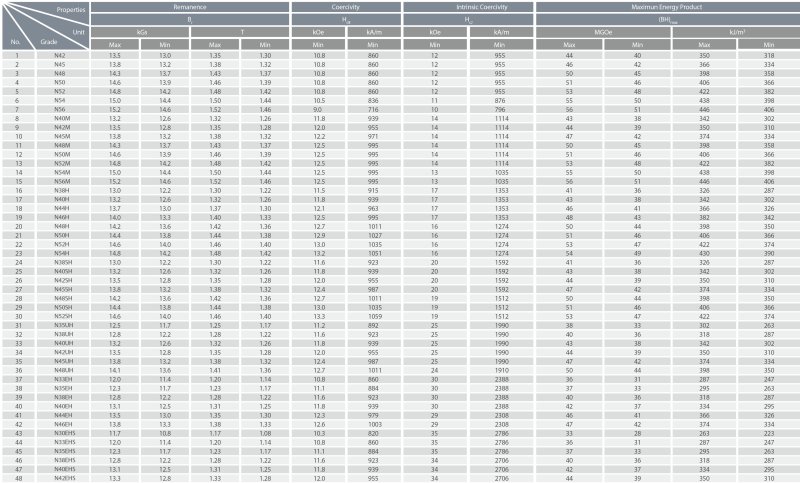 烧结-SANMAG 磁性能标准(1)N系列 Magnetic Properties of SANMAG Magnets (1)-N Series