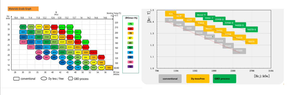 | 钕铁硼NdFeB材料等级表 | ||||||||
