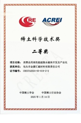 2025年1月14日,中国稀土学会/中国稀土行业协会 公布年度科学技术奖名单,包头市金蒙汇磁材料有限责任公司(简称“金蒙汇磁”)凭借“消费品用高性能超微永磁体开发及产业化”项目(证书编号:CRESTA2024-03-019-2-2),荣获“中国稀土学会科学技术二等奖”。该荣誉是行业对公司技术创新实力的权威认可,彰显了其在稀土永磁材料领域的深厚积淀。中国稀土学会/中国稀土行业协会科学技术奖是稀土行业