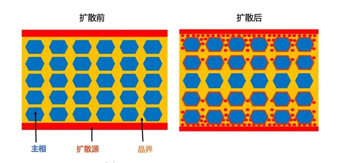 晶界扩散是一种先进的材料处理技术,其核心原理是:通过原子沿材料晶界的定向迁移,优化磁体微观结构。具体到钕铁硼永磁体,该技术通过在磁体表面涂覆富含重稀土(如Tb、Dy)的化合物或合金作为扩散源,随后在热处理过程中,利用晶界作为原子迁移的“快速通道”,使重稀土元素渗入磁体内部,形成梯度分布。