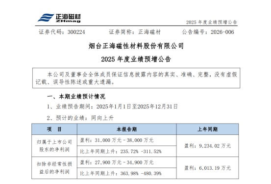 磁性材料在线讯  近日,正海磁材最新发布的2025年业绩预增公告显示,该公司预计全年实现归属于上市公司股东的净利润3.1亿元至3.8亿元,同比增长235.72%至311.52%。这一业绩远超市场预期,标志着公司自2024年业绩低谷后的强势反弹。扣非后净利润表现更为亮眼,预计为2.79亿元至3.49亿元,同比增幅高达363.98%至480.39%。