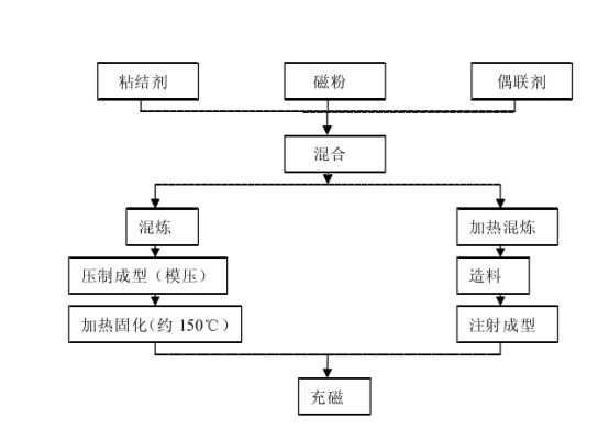 粘结钕铁硼是由钕铁硼永磁粉末与橡胶、塑料等粘结材料混合,按用户需求直接成型为各类永磁部件的功能材料。其主要制备工艺包括:
